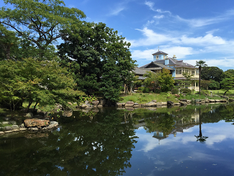 イギリス人建築家ジョサイア・コンドル(鹿鳴館の設計者)設計の洋館、和風建築、敷地内の池泉回遊式庭園で構成されています。